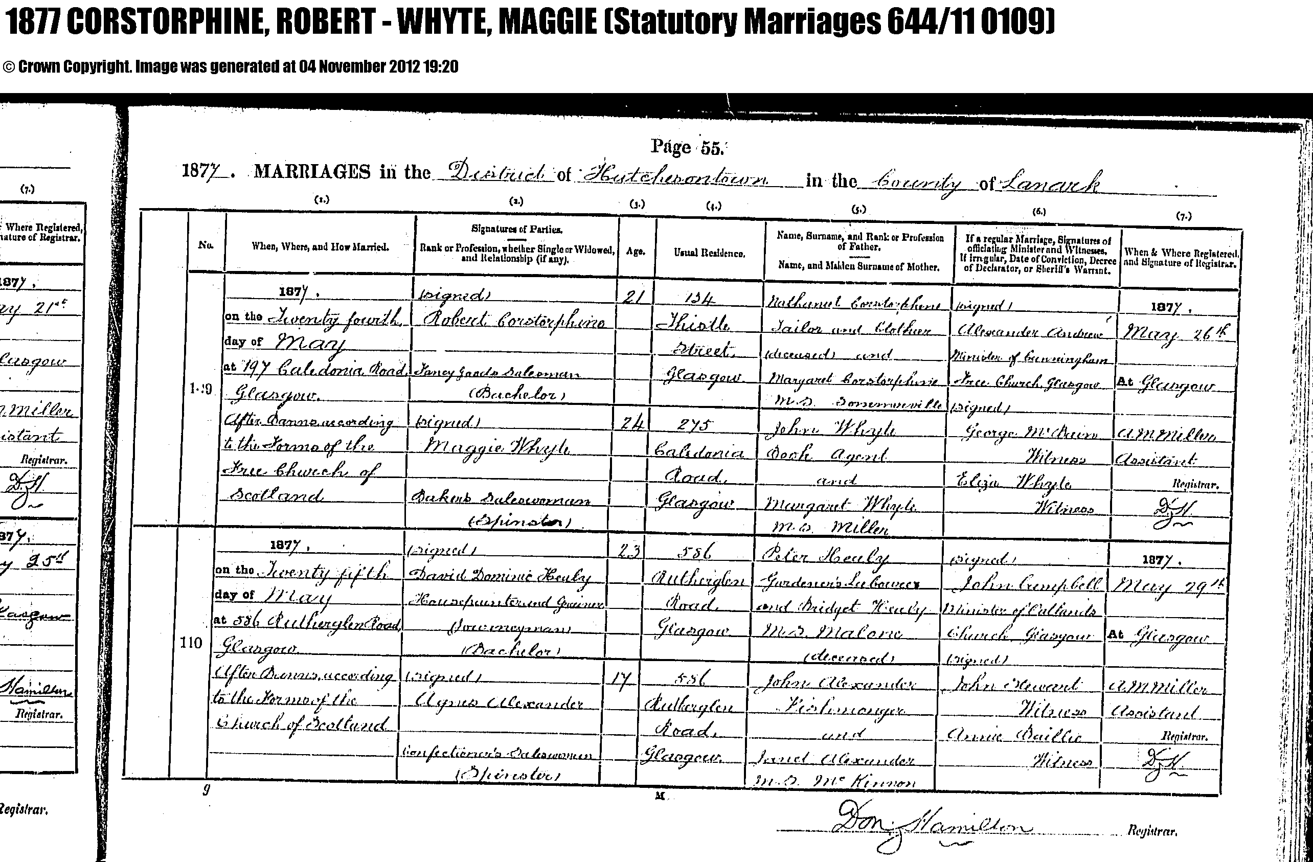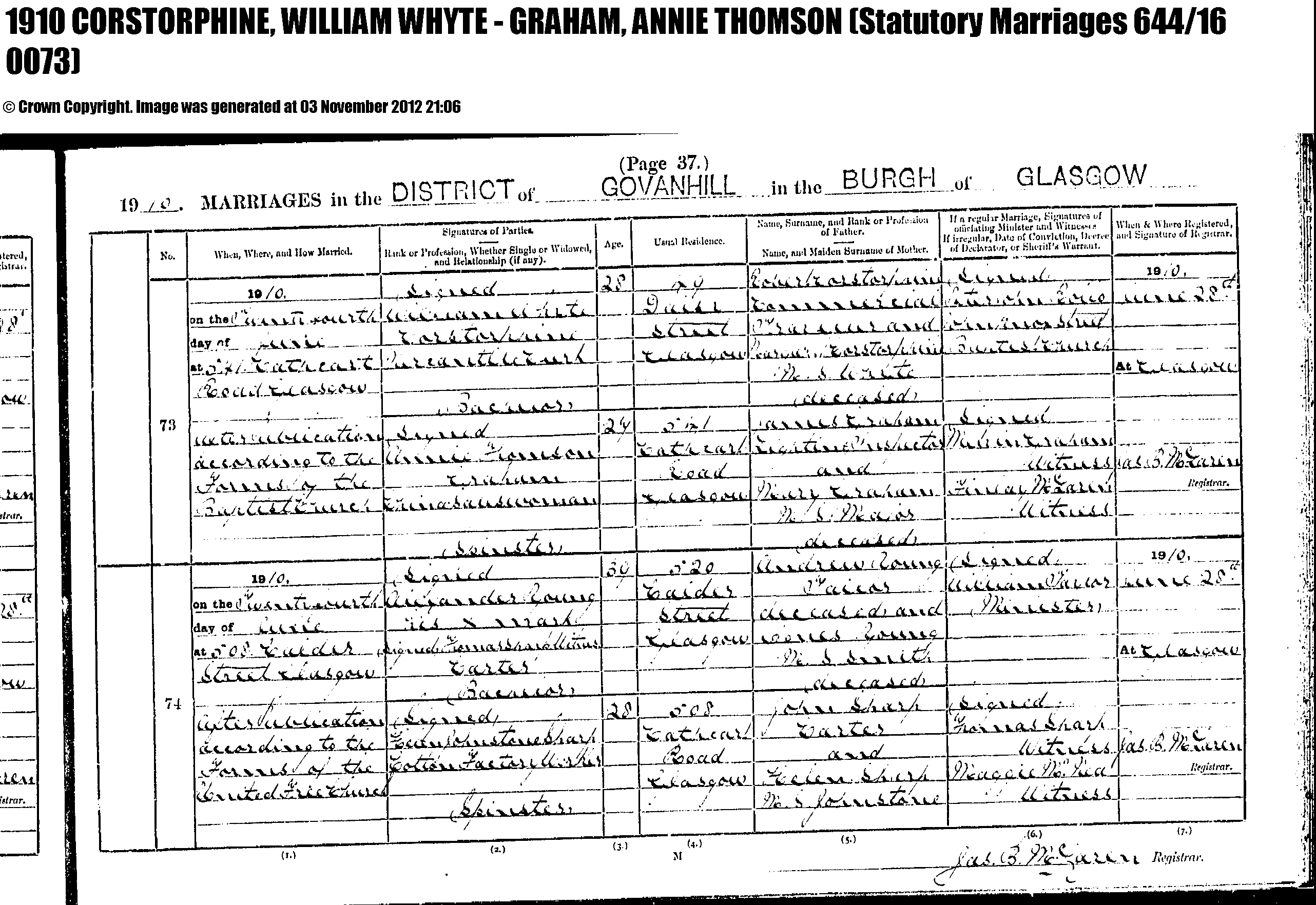 1st entry in image --- William was 28 lived “? Street” --- and Annie 27 lived on Cathcart Rd William’s Father looks like “Robert Corstorphine” – Occupation “Commercial ? “ (can’t make out mother – but deceased) Annie’s father “ James Graham” Occupation “Lighting Inspector” Wife’s name Annabella looks like “Mary” (can’t make out mother’s last name –deceased)