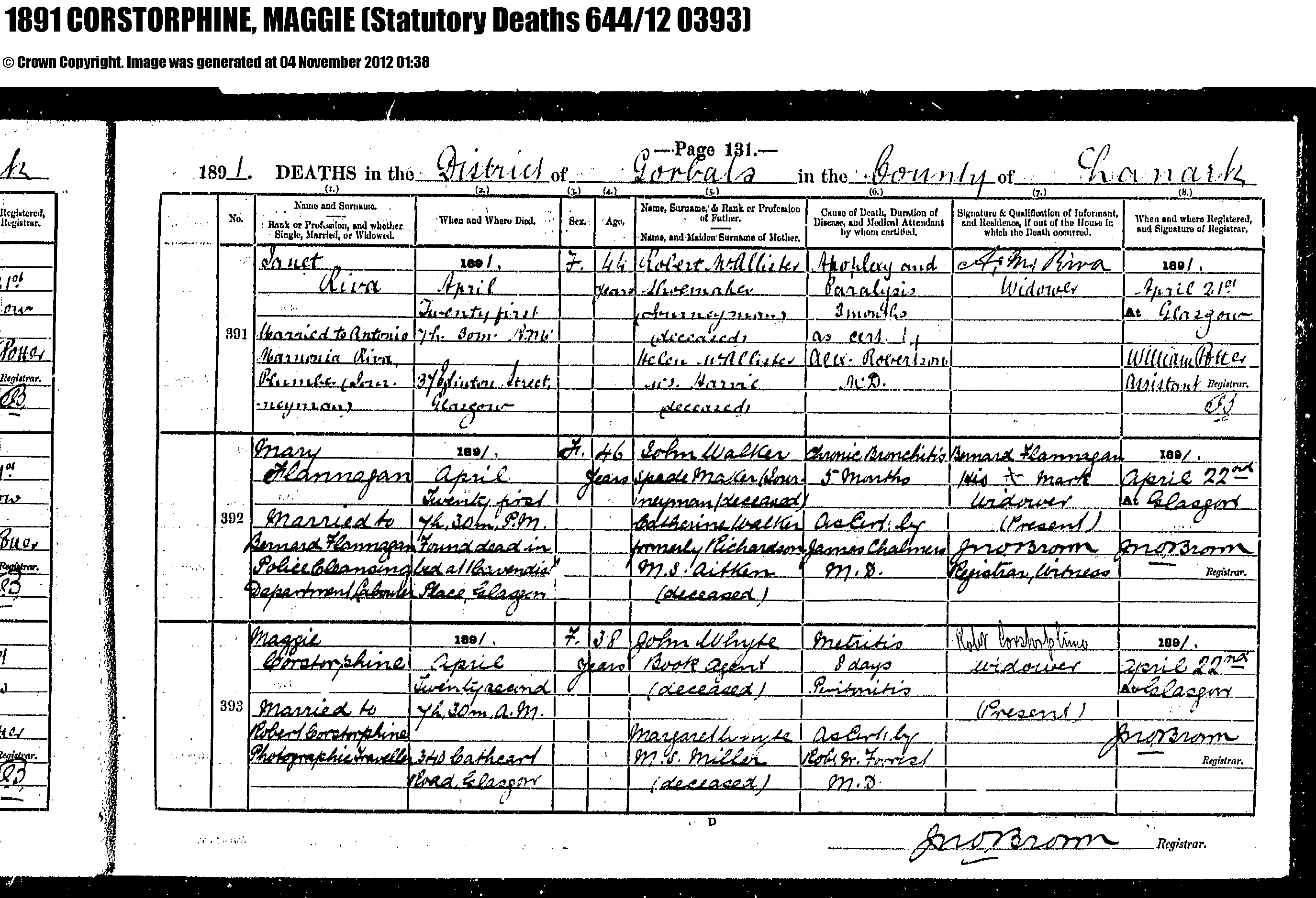Father Nathaniel died the same year 1877 1876 Nathaniel Corstorphine Death Search ReturnsYou searched for: Surname: "corstorphine"; Surname Option: Exact; Forename: "nathan"; Forename Option: Prefix; Sex: "Male"; Year From: 1855; Year To: 1877;