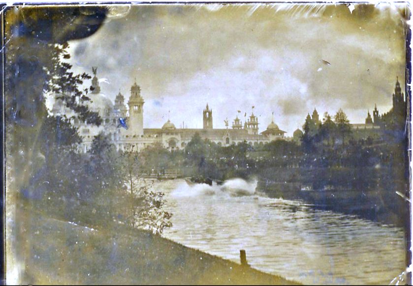 "Water Chute Boat showing waves caused" "also view of main buildings. Art Palace